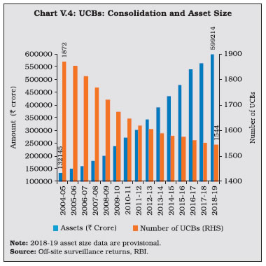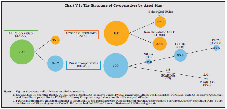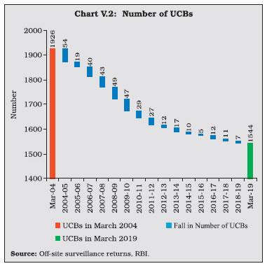 The consolidated balance sheet of urban co-operative banks expanded moderately in 2018-19 on the back of robust deposit growth which financed the pick-up in lending. Although their asset quality and provisions improved, a fall in interest income adversely affected profitability. Among short-term rural co-operatives, the financial health of state co-operative banks and district central co-operative banks weakened on account of an increase in the non-performing assets and slowdown in profitability. The soundness indicators of long-term co-operatives remained fragile. 1. Introduction V.1 In keeping with their ‘grassroots’ integration into the life and ethos of the widest sections of society, co-operative banks in India are invested with developmental goals among which financial inclusion has assumed crucial importance. These institutions play a critical role in last-mile credit delivery and in extending financial services across the length and breadth of the country through their geographic and demographic outreach. ![]() V.2 At the end of March 2019, credit co-operatives comprised 1,544 urban co-operative banks (UCBs) and 96,248 rural co-operative banks (end-March 20181), with the latter accounting for 64.7 per cent of the total assets of co-operatives (Chart V.1). V.3 UCBs and among the rural co-operatives, the State Co-operative Banks (StCBs) and the District Central Co-operative Banks (DCCBs) are registered either under the Co-operative Societies Act of the state concerned or under the Multi State Co-operative Societies Act, 2002. Banking laws were made applicable to co-operative societies since March 1, 1966. Currently, there is duality of control over StCBs/DCCBs/UCBs between the Registrar of Cooperative Societies (RCS) or the Central Registrar of Cooperative Societies (CRCS) and the Reserve Bank. While the mandates of the RCS/CRCS encompass incorporation, registration, management, recovery, audit, supersession of Board of Directors and liquidation, the Reserve Bank is invested with regulatory functions. The Reserve Bank is also entrusted with the responsibility of supervision of UCBs, entailing prescription of prudential norms for capital adequacy, income recognition, asset classification and provisioning, liquidity requirements and single/group exposure norms. In addition, it also helps in capacity building of employees and assist in implementation of IT infrastructure in UCBs. V.4 Primary Agricultural Credit Societies (PACS) and long-term co-operatives are outside the purview of the Banking Regulation Act, 1949. The NABARD has been given power under Section 35 (6) of the Banking Regulation Act to conduct inspections of StCBs and DCCBs. The NABARD also conducts voluntary inspections of State Co-operative Agriculture and Rural Development Banks (SCARDBs). V.5 The growth of these co-operative institutions has not been commensurate with that of other constituents of the banking sector in India. At the end of March 2018, the combined assets of urban and rural co-operatives were 10.6 per cent of the total assets of scheduled commercial banks (SCBs), down from 19.4 per cent in 2004-05. Several operational and governance-based impediments have operated as drags on their performance, stunting their growth. V.6 In this milieu, this chapter examines the performance of the urban co-operatives and rural credit co-operatives in the remaining five sections. Section 2 addresses the activities of UCBs from the point of view of their financial performance and asset quality. Section 3 reviews the performance of State Co-operative Banks (StCBs), District Central Co-operative Banks (DCCBs) and PACS. A brief description of long-term co-operatives is provided in section 4, notwithstanding the fact that they are outside the purview of the Reserve Bank’s regulation. Section 5 concludes with some overall perspectives. Detailed tables on balance sheets, financial performance indicators, asset quality and other salient indicators are presented in the appendix. V.7 Despite their large number, UCBs account for 3.6 per cent of the total assets of SCBs. Most of them are single branch entities, with limited avenues to raise capital. Successful international co-operative models highlights the role of umbrella organisation in strengthening the performance of co-operatives by providing a range of services like liquidity and capital support (Box V.1). V.8 Enabled by a liberal licensing policy, the period 1991-2004 saw phenomenal growth in UCBs’ number and asset size. Subsequently, this expansion turned unsustainable and some of them became weak and unviable over time. The Reserve Bank’s Vision Document 2005, adopted a multi-layered approach for bolstering the UCBs, including merger of weak UCBs with stronger ones and exit of unviable ones that has resulted in the state of consolidation that exists today (Chart V.2).