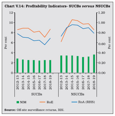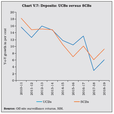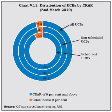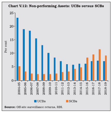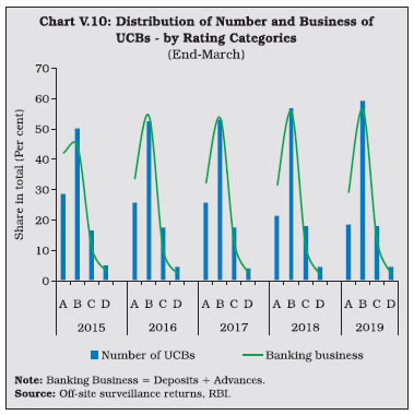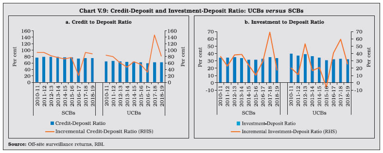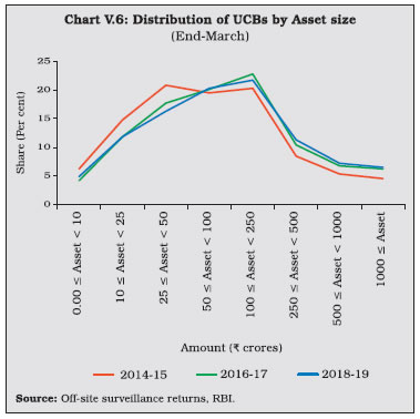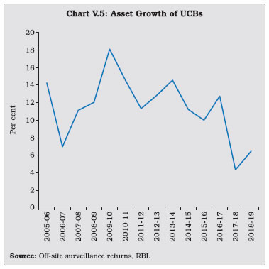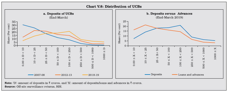 V.9 Maharashtra—which has the largest number of UCBs across states—accounted for the highest number of mergers (Chart V.3) V.10 Notwithstanding the fall in the number of UCBs, however, their combined asset size has continuously increased (Chart V.4). V.11 UCBs are classified for regulatory purposes into Tier-I and Tier-II categories, based on their depositor base6. Tier II UCBs have larger depositor bases and wider geographical presence than their Tier I counterparts. During 2018-19, the number of Tier II UCBs increased sharply (Table V.1). ![]() ![]() 2.1 Balance Sheet V.12 The combined balance sheet of UCBs witnessed robust expansion underscoring the effectiveness of measures taken to strengthen their financials. However, in the recent years, UCBs’ assets growth has moderated (Chart V.5). V.13 In 2014-15, the distribution of UCBs became bi-modal, with concentration in two asset brackets viz., ₹ 25 crore to ₹ 50 crore and ₹ 100 crore to ₹ 250 crore. Since 2016-17, however, the distribution has become uni-modal, with the largest frequency concentrated at the ₹ 100 crore to ₹ 250 crore asset bracket. Moreover, there has been a rightward shift in the distribution, with the share of UCBs with assets greater than ₹ 1,000 crore increasing to 6.5 per cent in 2018-19 from 4.6 per cent in 2014-15 (Chart V.6). ![]() V.14 Deposits—which accounted for 89.5 per cent of the resource base7 of UCBs—revived during 2018-19 after a deceleration in the previous year (Chart V.7). Nonetheless, UCBs’ deposit growth remains well-below the average of 13.9 per cent achieved during 2007-08 to 2016-17. ![]() V.15 As deposit growth moderated during 2017-18, lending had to be financed by a steep increase in borrowings. This growth in borrowings reversed during 2018-19 as pick-up in deposit growth financed the increase in loans and advances (Table V.2). ![]() ![]() V.16 While UCBs with deposit bases upto ₹ 10 crore formed the modal class at the end of March 2008, the ₹ 100 crore to ₹ 250 crore bracket became the modal class at the end of March 2019 (Table V.3 and Chart V.8a). This suggests an increase in average deposit per account as well as an expansion of the customer base of UCBs. V.17 In contrast, UCBs with advances in the range of ₹ 10 crore to ₹ 25 crore formed the modal class during 2018-19 (Chart V.8b). V.18 Since 2015, the SLR requirements of UCBs are being reduced progressively in line with the prescription applicable to SCBs. Furthermore, since UCBs are governed by Basel I regulatory norms, the liquidity coverage ratio (LCR) requirement is not applicable to them. As SLR investments – constituting 88.9 per cent of total investments, primarily in central government securities – moderated over the last two years, overall investments also followed suit (Table V.4). However, non-SLR investments expanded by a faster pace. Incidentally, in August 2018, the list of eligible counterparties for trading in secondary market for this type of investment was widened. ![]() V.19 During 2016-17 and 2017-18, the incremental credit-to-deposit ratio of UCBs rose above those of SCBs, owing to the impact of high deposit growth on account of demonetisation in 2016-17 and lower credit growth of SCBs in the next year. This upturn was, however, reversed in 2018-19 with a pick-up in credit growth of SCBs (Chart V.9a). V.20 Since April 1, 2015 the balances of UCBs with DCCBs and StCBs ceased to be treated as SLR investments. Consequently, the investment-to-deposit ratio of UCBs fell below that of SCBs for the first time and remained so in subsequent years as well (Chart V.9b). ![]() 2.2 Soundness V.21 A CAMELS (capital adequacy; asset quality; management; earnings; liquidity; and systems and control) rating model is used to classify UCBs for regulatory and supervisory purposes8. UCBs in the top-ranking categories— with ratings A and B—accounted for 78 per cent of the sector (Table V.5). The share of UCBs in category A has, however declined in the last five years with a concomitant increase in category B banks. The share of UCBs in category D has remained in the range of 4 to 5 per cent in the last five years (Chart V.10). 2.3 Capital Adequacy V.22 Under the Basel I norms, UCBs are required to maintain a minimum statutory capital to risk weighted assets ratio (CRAR) of 9 per cent, with no additional requirements like capital conservation buffer and high common equity tier 1 (CET 1) capital ratio. As of end-March 2019, more than 96 per cent of UCBs maintained CRAR of 9 per cent and above (Table V.6). ![]() V.23 At a disaggregated level, non-scheduled UCBs (NSUCBs) that are characterised by lower asset size have better capital positions than scheduled UCBs (SUCBs). During 2018-19, the share of NSUCBs maintaining CRAR of 9 per cent and above was 96 per cent vis-a-vis 92 per cent for SUCBs. On the downside, however, four SUCBs had negative CRAR in that year (Chart V.11). Latest supervisory returns suggest deterioration in CRAR of SUCBs to 9.8 per cent in H1:2019-20 from 13.5 per cent inH1:2018-19. ![]() 2.4 Asset Quality V.24 While UCBs had higher NPA ratio than SCBs till 2014-15, this was reversed on account of two distinct factors. First, the asset quality review (AQR), which resulted in better asset recognition of SCBs led to their NPA ratio rising to its true level. Second, the asset quality of UCBs has been gradually improving over time (Chart V.12). V.25 During 2018-19, UCBs registered moderate improvement in their asset quality, driven by the decline in the GNPA ratio of NSUCBs. Notwithstanding this improvement, the NSUCBs continue to have higher NPAs than SUCBs (Table V.7). SUCBs’ GNPA ratio deteriorated to 10.5 per cent in H1: 2019-20 reflecting large delinquencies in one of the fraud hit banks. V.26 Larger increase in provisions vis-à-vis GNPA enabled an improvement in UCBs’ provisioning coverage ratio (PCR) (Chart V.13). Given the elevated level of GNPA ratio in NSUCBs in compar