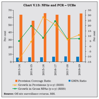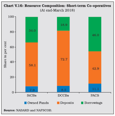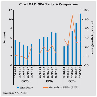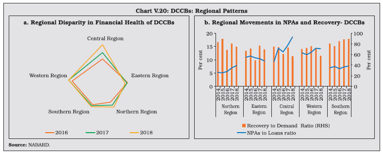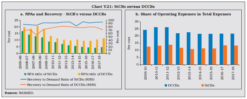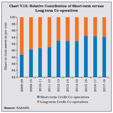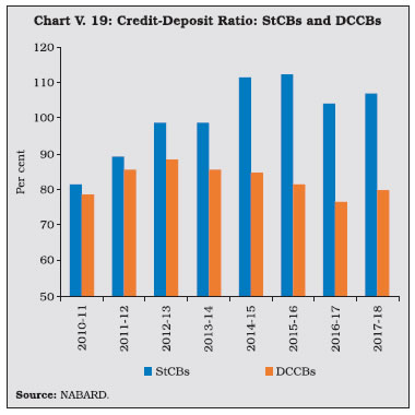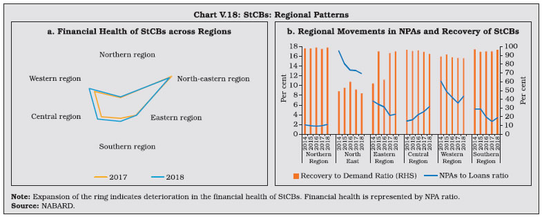 V.33 The composition of credit to the priority sector by UCBs shows that lending to micro, small and medium enterprises (MSMEs) accounted for 60.7 per cent of the total priority sector advances, followed by advances to housing. Given the urban focus of UCBs, their share of agricultural lending under the priority sector is low. V.34 UCBs are mandated to provide 10 per cent of adjusted net bank credit (ANBC) to weaker sections11. During 2018-19, credit to weaker sections fell below the minimum target of 10 per cent of ANBC and their share in overall lending to the priority sector also fell to 21 per cent. V.35 Rural co-operatives play an important role in delivering affordable institutional credit and promoting financial inclusion in underbanked areas through their geographical outreach. Short-term co-operatives primarily meet crop loan requirements whereas long-term co-operatives make credit available for capital formation in agriculture, rural industries and housing. Although the focus of rural co-operative lending is agriculture, the share of rural co-operatives to this category of loans —which was as high as 64 per cent in 1992-93—has fallen dramatically over the years while commercial banks have acquired a dominant position (Table V.11). V.36 As of March 2018, short-term cooperatives comprising StCBs, DCCBs and PACS accounted for 94.2 per cent of the total assets of rural co-operatives (Chart V.15). V.37 Long-term co-operatives comprise State Co-operative Agriculture and Rural Development Banks (SCARDBs) and Primary Co-operative Agriculture and Rural Development Banks (PCARDBs). Due to the limited range of credit products and relatively lower outreach, their share in the total assets of rural co-operatives has been declining over the years. ![]() V.38 The structure of short-term rural cooperatives is largely federal – with StCBs acting as the apex body – whereas that of long-term co-operatives varies significantly across states. Presently, out of the thirteen fully functional SCARDBs, five (Gujarat, Jammu & Kashmir, Puducherry, Tripura and Uttar Pradesh) are unitary, i.e., they operate through their branches with no separate PCARDBs, six (Haryana, Karnataka, Kerala, Punjab, Rajasthan and Tamil Nadu) are federal where they operate through PCARDBs, and two (Himachal Pradesh and West Bengal) have mixed structure with SCARDBs operating through PCARDBs as well as through their branches. 3.1 Short-term Co-operatives V.39 Short-term co-operatives are arranged in a three-tier structure in most of the states, StCBs at the apex level, DCCBs at the intermediate level and PACS at the grassroots level. Deposits are the dominant component of the liability structure of StCBs, and especially of DCCBs whose extensive branch network enables higher deposit mobilisation. In the case of PACS, however, borrowings from StCBs and DCCBs are the key sources of funds12 (Chart V.16). 3.1.1 State Co-operative Banks V.40 StCBs are established in each state to mobilise deposits, provide liquidity support and offer technical assistance to DCCBs and PACS. In terms of size, StCBs account for 23 per cent of assets of short-term rural co-operatives and rely on the NABARD refinance facility as the major source of borrowings. ![]() Balance Sheet Operations V.41 The consolidated balance sheet of StCBs contracted in 2017-18 on account of a decline in investments and cash and bank balances on the asset side. On the liability side, borrowings declined due to a fall in the short-term refinance support provided by NABARD. Deposits, which account for more than half of the liability side, decelerated during 2017-18, from a high base in the previous year when StCBs were allowed to garner deposits in the form of specified bank notes in the post-demonetisation period. On the assets side, StCBs unwound their investments to extend loans and advances especially against the backdrop of lower refinance support and muted deposits growth (Table V.13). V.42 The latest data available for scheduled StCBs show acceleration in both deposit and credit growth in 2018-19 (Table V.14). Profitability V.43 Net profits of StCBs decelerated during 2017-18 after a significant increase in the previous year. The slowdown mainly reflected a sharp increase in provisions and contingencies in consonance with deteriorating asset quality during the year. On the positive side, however, net interest income rose; although interest income decelerated, it was outweighed by the contraction in the interest expenses. Another positive factor was the slowdown in operating expenses, notwithstanding the acceleration in the wage bill. Consequently, operating profits of the StCBs reversed the contraction of the previous two years and grew in double digits (Table V.15). Asset Quality V.44 The asset quality of StCBs—as reflected in the NPA ratio—had been improving continuously since 2012-13, but it deteriorated during 2017- 18. Alongside significant accretions to NPAs, both the doubtful and loss component of NPAs also increased, notwithstanding an increase in the recovery-to-demand ratio (Table V.16). V.45 This deterioration is stark against the backdrop of improvement in asset quality of UCBs and SCBs (Chart V.17). V.46 From a regional perspective, there has been an increase in the NPA ratio in 2017-18 across all regions except in the north-eastern region (Chart V.18a). The all-India recovery-to-demand ratio improved for StCBs, driven by the northern, eastern and southern regions. (Chart V.18b). 3.1.2 District Central Co-operative Banks V.47 DCCBs—the intermediate tier in the short-term rural co-operatives structure—mobilise deposits from the public and provide credit to the public and PACS. DCCBs’ borrowings comprise of loans and advances from StCBs and direct refinancing from the NABARD. They have a large number of depositors, given their branch network. This also results in a lower credit-to-deposit ratio than StCBs (Chart V.19). ![]() Balance Sheet Opera