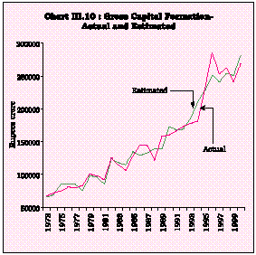 3.21 The rate of nominal gross capital formation (GCF) rose from 15.8 per cent in 1970-71 to 22.7 per cent in 1999-2000 undergoing two phases of deceleration, first in the early 1980s and again in the second half of the 1990s. The rate of capital formation has been rising in the private sector while in the public sector, it has been generally declining in the 1990s (Chart III.9). An analysis of the behaviour of GCF in terms of industry of origin in the 1990s indicates that the rate of capital formation in agriculture exhibited a slow decline from 2.0 per cent in 1992-93 to 1.7 per cent in 1998-99. The rate of capital formation in industry underwent a steep fall from 1995-96 onwards. There was a declining trend in the rate of capital formation in the services sector in the 1990s until 1999-2000. In all, a clear slowdown in the investment demand across the sectors was visible in 1990s, especially in the mid-1990s. This has been reflected in the downturn of growth.