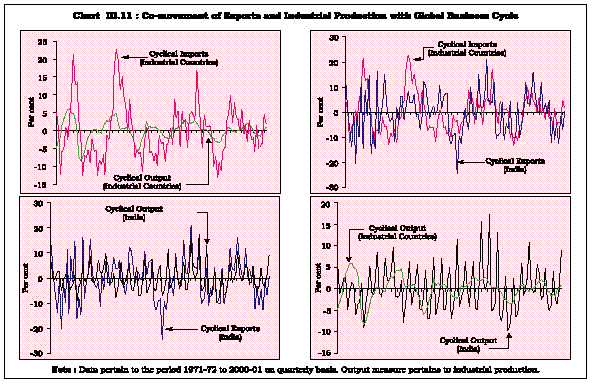 3.29 External demand has played a relatively small role in influencing the course of the business cycles in India, given the low degree of openness. The empirical evidence, however, suggests that trade flows provide conduits for global integration which are stronger and larger than what any conventional measure of net exports would suggest. This is increasingly evident in India with the pattern of exports and industrial production exhibiting certain degree of co-movement with the global business cycle (Chart III.11).