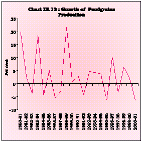 3.35 Agricultural output growth registered a sharp increase in the immediate post-green revolution phase largely due to a growth in yields; however, the growth pattern has not been uniform with a tendency towards deceleration in the 1990s (Table 3.9 and Charts III.12 and III.13).