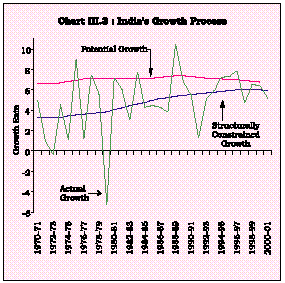 3.8 Taking the diagnosis further, an incision can be made into the growth path of real GDP by decomposing it into its 'time-series' components - trend, seasonal, cyclical and irregular elements-depending upon the frequency and regularity of their recurrence. Seasonal components are discernible in monthly and quarterly data but not in the annual data. The cyclical and irregular components are collected together and removed by 'filtering' real GDP through the commonly employed Hodrick-Prescott (HP) filter over the period 1970-71 to 2000-01. Separating out cyclical and irregular influences from the actual growth of real GDP yields what can be termed as the 'structurally constrained' growth path of the economy determined by its production structure, institutional characteristics and the various impediments acting on aggregate supply. The path of structurally constrained growth has undergone a distinct upward shift in the early 1990s as liberalisation unlocked hidden capacities and unleashed repressed productive forces. In the following years, the impetus for growth was not sustained and the structurally constrained path tended to slope downwards in the second half of the 1990s. These movements have had a fundamental influence on the potential growth path of the Indian economy, i.e., the growth which is realisable with the full utilisation of productive capacities in the economy. Empirical studies conducted in India show the sensitive nature of the estimates of potential growth to the choice of methodology (RBI, 1999). Applying the OECD (1995) method, the potential growth path is generated from the actual data on real GDP by obtaining a locus of the peak growth rates achieved in the period of study and then smoothing it with a three-year moving average. Movements in the potential growth are found to respond to the behaviour of the structurally constrained growth path. The liberalisation 'hump' of the early 1990s shifts the potential growth path upwards; again the dipping of the potential growth path appears to be associated with the slowing down of structurally constrained growth (Chart III.3). Thus, by releasing the structural constraints, it is possible to shift the long run growth to a higher trajectory.