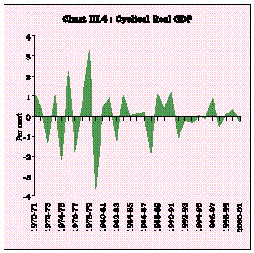3.9 The exercise also provides some insights into the characteristics of cycles in the Indian economy. Cyclical and irregular components (which were jointly separated by using the HP filter) are disentangled further by using a conventional business cycle filter, i.e., the Band-Pass filter (Baxter and King, 1999) which produces a smooth cycle by eliminating the outliers over the 'band' of frequencies. The cyclical component of real GDP is depicted in Chart III.4. Its behaviour suggests that during the 1970s and early 1980s, cyclical fluctuations were frequent and sharp in magnitude, varying in the range of -3.6 per cent to 3.3 per cent, and emanating mainly from supply shocks (such as agricultural failures, terms of trade shocks and war). In the 1990s, the amplitude of cyclical fluctuations has become relatively small, varying in the range of -1.0 to 1.3 per cent. With the gradual weakening of the cycle, the behaviour of the structural component of growth has dominated the overallgrowth process.