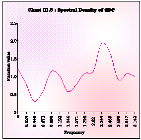 3.10 Spectral analysis enables further examination of the underlying nature of cycles in the Indian economy. A spectral density function using 'Bartlett' weights in the estimation of long-run variances in time series over the frequency domain is fitted to data on real GDP (first differences of logarithmically transformed series) to ascertain the significance of the presence of cycles as well as to measure the duration and amplitude of the fluctuations. The spectral density function indicates the presence of short- to medium-term cycles (Chart III.5). It has a peak value corresponding to 2.8 years (2.2 in terms of frequency), suggesting that cycles in India are of a three-year duration which corroborates the use of a three-year moving average to obtain potential output from peak rates in the preceding exercise. The relative importance of permanent and transitory components of real GDP growth can be assessed from the spectral density over a long horizon (i.e., at zero frequency) (Cochrane, 1988). The transitory component, representing cyclical effects, appears to account for up to one-third of the total variations in real GDP growth over the entire sample period (1970-2000).