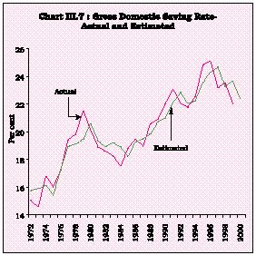 3.19 The savings behaviour in the Indian context is analysed for the period 1970-71 to 1999-2000 by estimating savings functions at the aggregate level, and also for private saving. The empirical estimates indicate that real per capita income and financial deepening have significant positive effects on the aggregate saving rate (gross domestic saving rate) and are its main determinants1; other things remaining the same, a one per cent increase each in income and intermediation ratio (secondary issues to primary issues ratio, as used in flow of funds accounts) would induce an increase in aggregate savings rate by 6.6 percentage points and 3.4 percentage points, respectively. The interest rate, i.e., real deposit rate, has a lesser but positive impact on gross savings rate; implying that as much as 12 percentage points change in the real interest rate is required to increase aggregate savings rate by one percentage point. The results indicate that the dynamic response of the private saving rate to per capita income (per capita disposable income is the relevant scale variable in studying private saving behaviour) works out to 7.8. The in-sample fits of the estimated equations for aggregate and private savings rates, are reported in Charts III.7 and III.8.