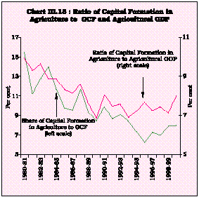 3.48 The lack of capital has been a primary factor impeding the adoption of new technological inputs, which are capital intensive. The size and flow of financial resources to agriculture, both in terms of investment and working capital have shrunk significantly. Despite the stipulation of sub-targets for agriculture at 18 per cent under priority sector, credit has not flowed to the desired extent. There exist many escape routes with regard to priority sector lending targets, such as the option to invest in RIDF and place deposits with SIDBI. Direct finance to small and marginal farmers (with land holdings up to two hectares) has been slowing down in recent years (Table 3.15). The average growth in loans outstanding to marginal farmers has decelerated sharply during the 1990s as compared with the growth recorded in the 1980s (Charts III.16 and III.17).