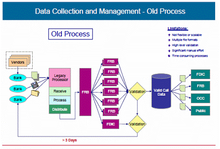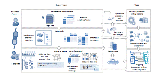 2.0 XBRL Framework The core of XBRL is the XBRL 2.1 Specification. Modules build upon the base XBRL specification, providing additional functionality. The XBRL Specification provides a framework that divides XBRL into two main parts: XBRL taxonomies, which are XML schemas that define the concepts and articulate a controlled vocabulary used by XBRL instances, and XLink linkbases, which provide additional information about those concepts. XBRL instances, which contain the facts being reported, along with contextual information for those facts. XBRL Taxonomy Parts XBRL taxonomies have various physical aspects and express concepts, resources, and relations. These work together to provide the required functionality to express the meaning of business information that is to be exchanged. Taxonomy schemas and linkbases XBRL taxonomies are comprised of two parts: Taxonomy schemas are the XML Schema part of the XBRL taxonomy. Taxonomy schemas contain concept definitions that take the form of XML Schema elements. Linkbases are the XLink part of the XBRL taxonomy and are also XML documents. The term linkbase is an abbreviation for link database. Linkbases are physical aspects used to express a logical aspect called networks. Networks are of two types: resource and relation. Resource and relation networks are expressed in the XLink syntax in the form of an extended link. Extended links are like containers that hold the data contained within linkbases. Discoverable taxonomy sets A single XBRL taxonomy may be comprised of a set of multiple taxonomy schemas and linkbases. This set is indicated in XBRL as discoverable taxonomy set (DTS). A DTS is governed by various discovery rules, specified by the XBRL Specification, that XBRL processors understand. A DTS can contain any number of taxonomy schemas and/or linkbases and can start from either a taxonomy schema, a linkbase, or an XBRL instance. Networks and extended links Networks are a logical aspect of XBRL expressed physically as a set of linkbases. Linkbases exist within the physical model and are collections of extended links. Extended links work slightly differently in XLink than they do in XBRL. While in XLink, each extended link is physically separated in the case of XBRL, a role attribute is added to an extended link. A network is a collection of all the extended links of a specific type with the same extended link role. An extended link role is akin to a unique identifier expressed as a role attribute of an extended link. Resource networks provide additional information about a concept. The additional information is in the form of an XLink resource. Of the five standard types of linkbases, label and reference are resource linkbases, and they express resource networks. Relation networks express relations between concepts using XLink arcs. Of the five standard types of linkbases, presentation, calculation, and definition are relation linkbases, which they express as relation networks. Relations (expressed as an XLink arc) can have different arc roles to help further categorize relations. XBRL instances contain the information that is being exchanged. That information is expressed in the form of facts. Each fact is associated with a concept from an XBRL taxonomy, which expresses the concept and either defines it or points to a definition of the concept external to the XBRL taxonomy by using one or more XBRL references. Concepts are associated with an XBRL instance by being part of the DTS. 3 Major implementation of XBRL across the world i. Banking – US FDIC Call Report Many regulators across the world share some common challenges in their reporting functions owing to the nature of their requirements. Some of the most common ones are as defined below: • Securely obtaining data that can be entered automatically and seamlessly into systems • No re-keying, reformatting and / or other "translation" required to be done on the data. • Reducing costs through automation of routine tasks. • Quickly and automatically identifying errors and problems with filings. • Validating, analyzing and comparing data quickly, efficiently and reliably. • Shifting focus and effort of the concerned filers on analysis and decision-making rather than just data manipulation. • Promoting efficiencies and cost savings throughout the regulatory filing process. Regulators in the banking sector in the United States of America recognized these challenges and undertook a modernization project to overcome them. Members of the Federal Financial Institutions Examination Council (FFIEC), the Federal Deposit Insurance Corporation (FDIC), the Federal Reserve System (FRS), and the Office of the Comptroller of the Currency (OCC) sought to resolve these challenges through a large-scale deployment of XBRL solutions in its quarterly bank Call Report process. In addition, through the modernization project, the FFIEC also sought to improve its in-house business processes. 2. Legacy Data Collection Process – A private sector collection and processing vendor acted as the central collection agent for the FFIEC. After receipt of the data from the agent, the FFIEC Call Agencies processed the data. The FRS transmitted all incoming data received from the agent to the FDIC. The FDIC and FRS then performed analysis on the received data and independently validated the data series for which each was responsible. The validation process consisted of checking the incoming data for “validity errors,” including mathematical and logical errors, and “quality errors.” Checking for quality errors included tests against historically reported values and other relational tests. FFIEC Call Agency staff corrected exceptions by manually contacting the respondents. They entered corrections and/or explanations into the FDIC’s Call System and the FRS’s STAR System. In some cases, the respondents were required to amend and resubmit their Call Report data. ![]() Source: Approach paper on Automated D